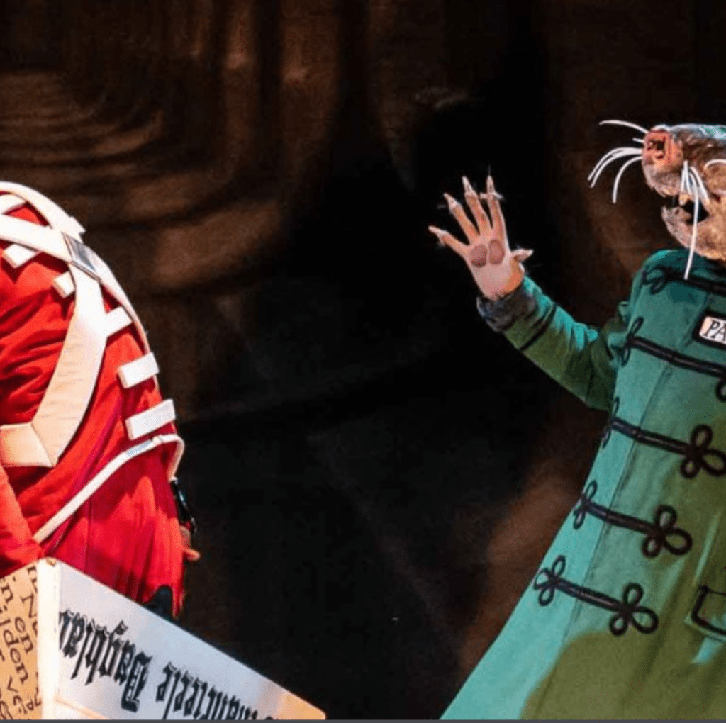 Arrive 30 minutes before showtime for a pre-show featuring a behind-the-scenes look at Lookingglass Theatre. Cast members dressed in Ana Kuzmanic’s elaborate, festive costumes steadily reveal painted toys and other surprises from a giant advent calendar. The welcoming pre-show rumble of murmurs, instruments, and program ruffling felt like being home again. Audience feedback is a standout advantage of pre-recorded theatre productions. It’s been a while since I’ve heard a unified “aww” from the crowd, and these aspects of communal viewing are probably what I miss the most from in-person theatre.