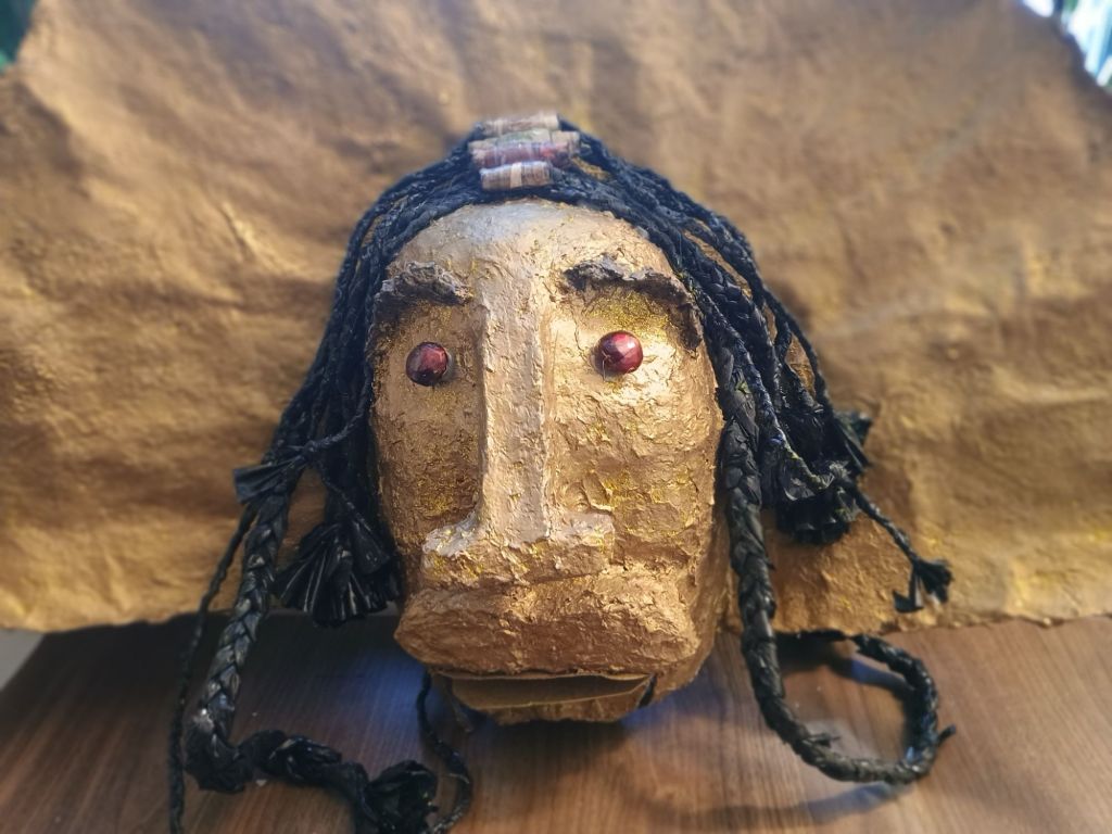 URBAN SUN started out much smaller, bu that did not suit his shining personality. So, I added more glue, more paper, more , More layers of glue and paper, more beads, more hair, more glitter. Just more! And before I knew it Urban Sun was as big as he needed to be. I wish I had taken more photos of him in his earlier stages, but, unfortunately, I did not.