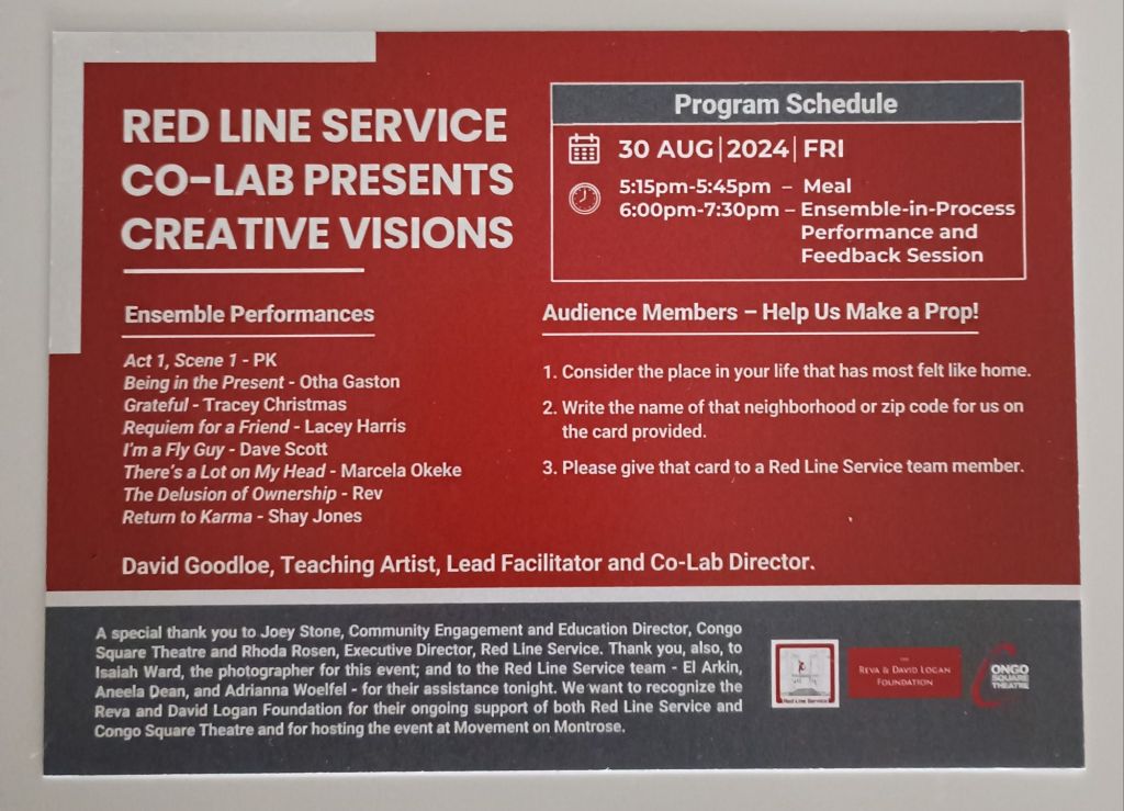 The Red Line Service Co-Lab Creative Visions Ensemble performance is scheduled for Friday, August 30, 2024 at Movement on Montrose. Eight RLS artists will share personal stories and musical performances followed by a feedback session. This series was developed with the guidance of David Goodloe of Congo Square Theatre.
